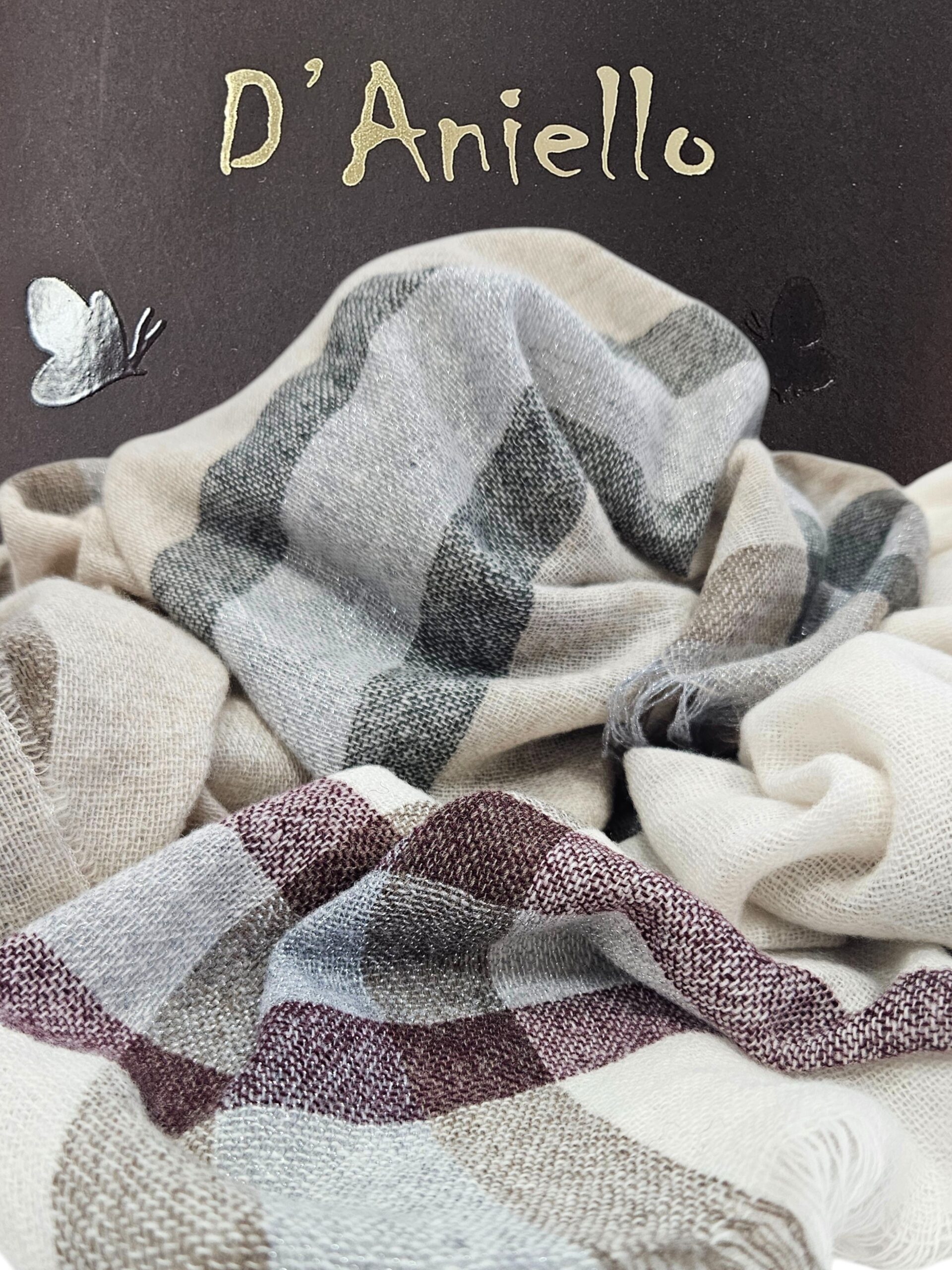 Nelle collezioni D’Aniello Primavera Estate ed Autunno Inverno c’è tutto il fascino e lo stile Made in Italy, il marchio “D’Aniello” seleziona le fibre più nobili e propone sciarpe, foulards, stole, mantelle e giacche in pelle il tutto creato con connotati artigianali, seguendo le più moderne tecniche di produzione.