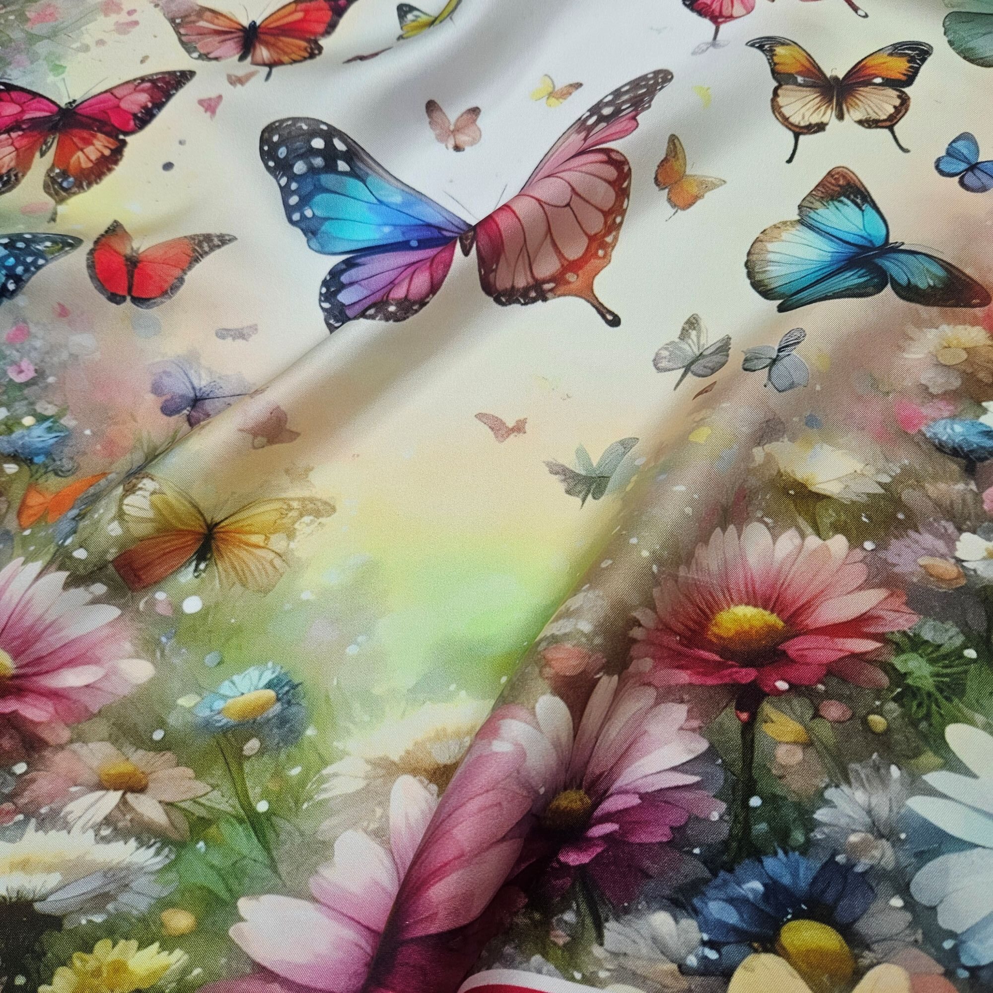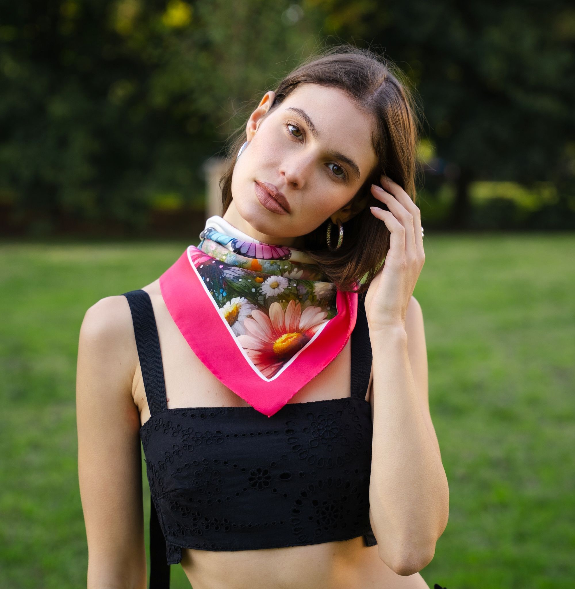 Un turbinio di delicatezza e colore avvolge questo foulard in seta pura. Il motivo centrale è un gioioso volo di farfalle, disegnate con tratto preciso e realistico e con tinte vivaci e accese.