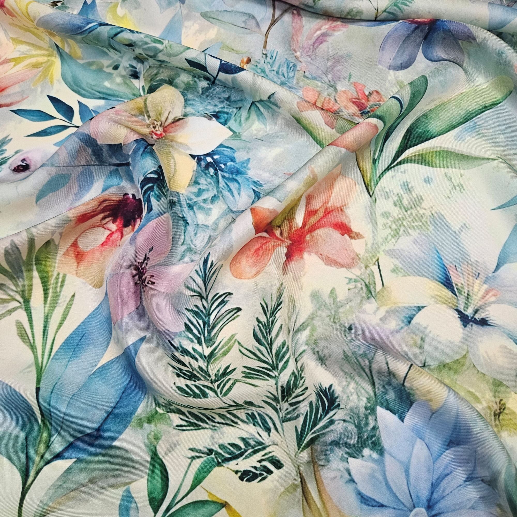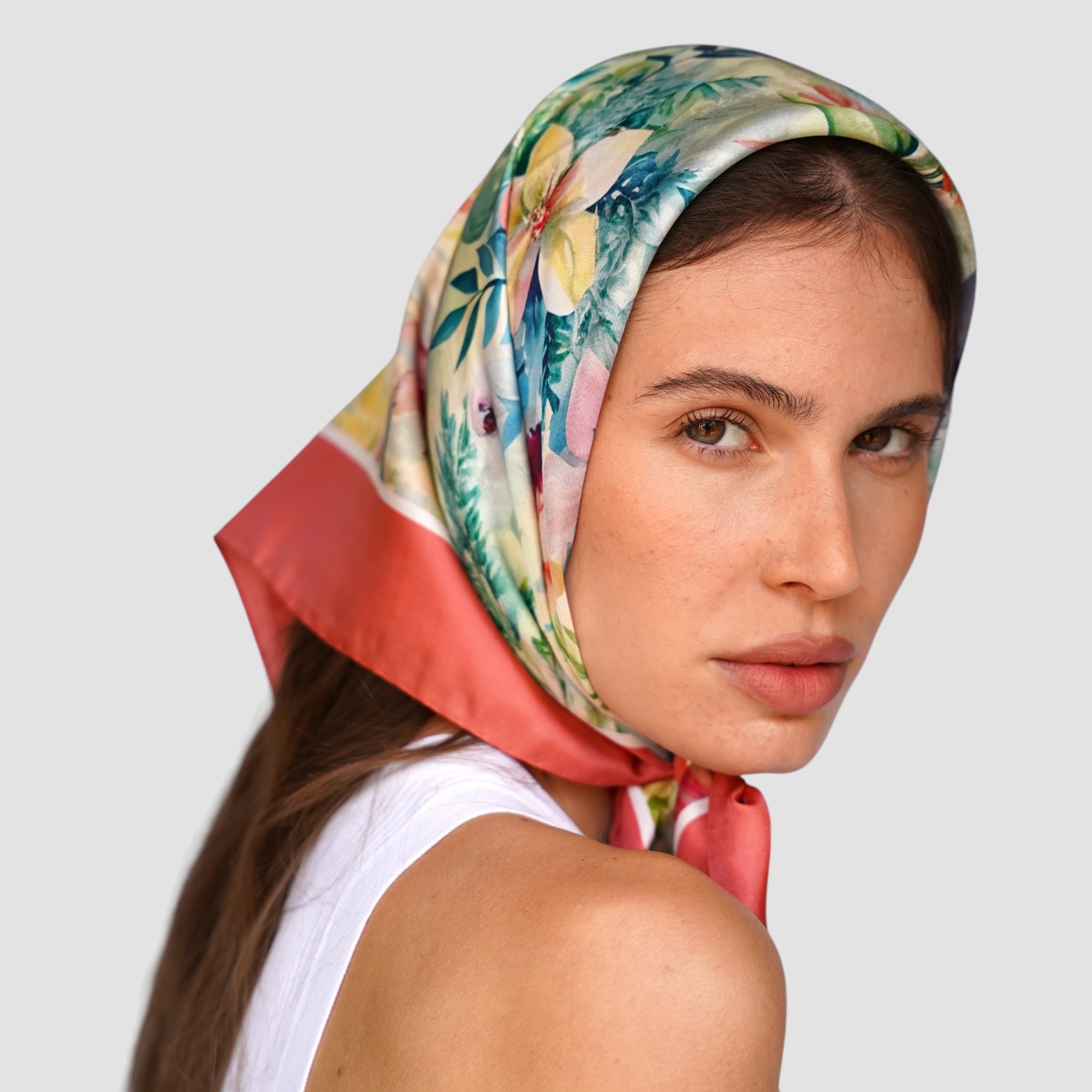 Un foulard di pura seta leggera e brillante, che cattura l’esuberanza di un paradiso esotico. Il motivo è un floreale tropicale rigoglioso nei toni del verde smeraldo, rosa fucsia e giallo sole. L’intera composizione è incorniciata da un vibrante bordo corallo, che definisce i contorni con un’energia vivace e moderna.