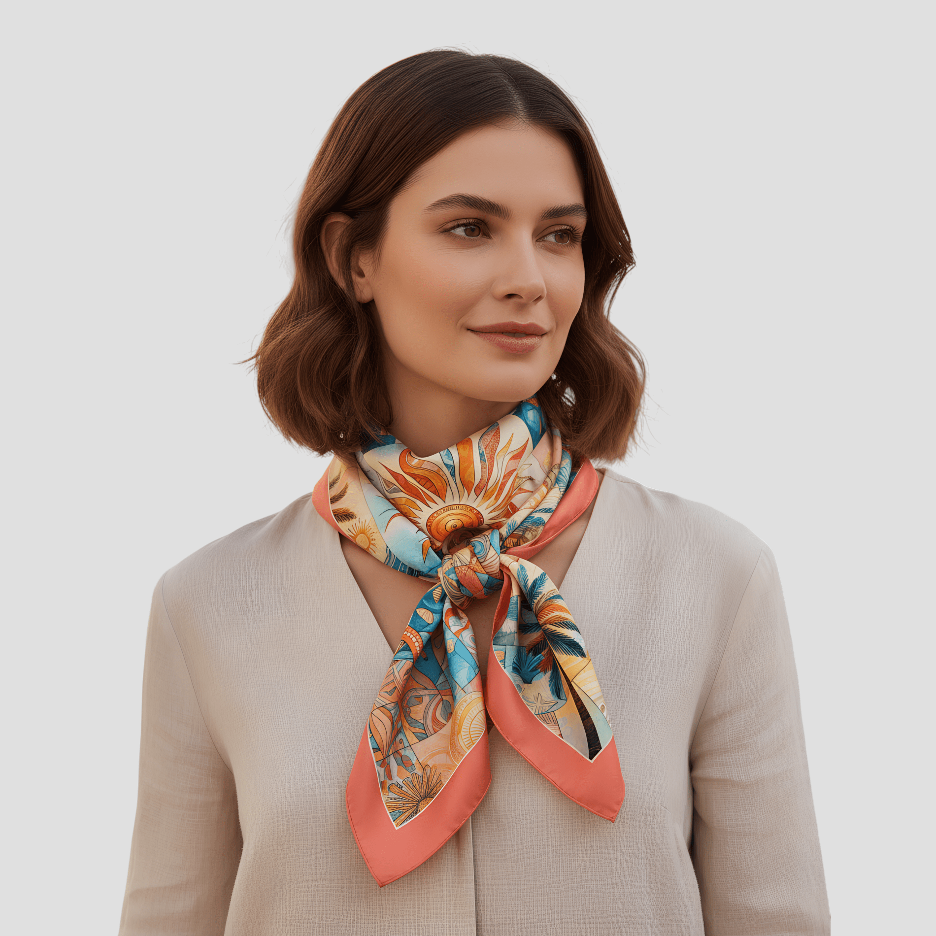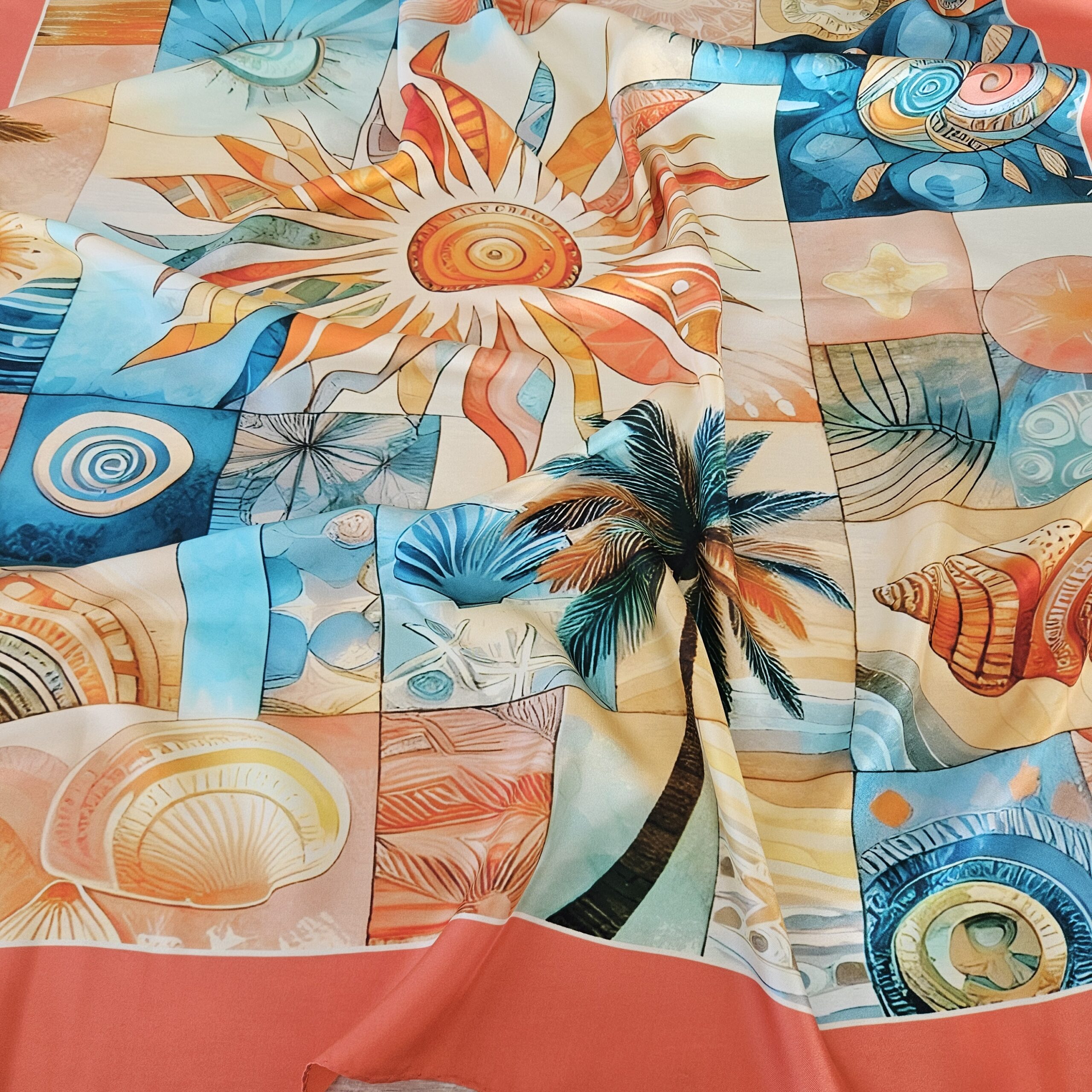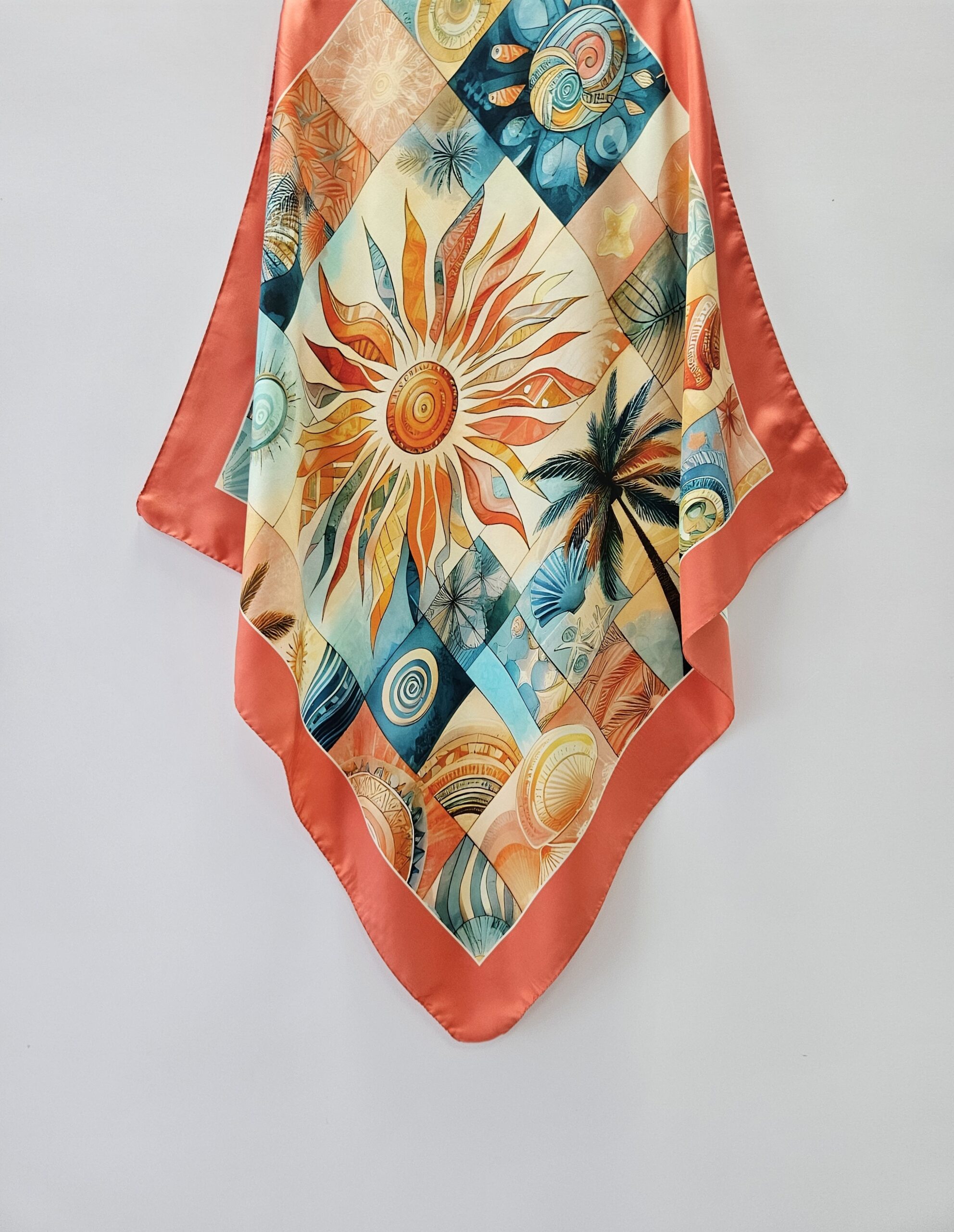Un’esplosione di energia estiva, questo foulard cattura il calore del sole e la freschezza delle palme in un design vibrante. Le cromie che spaziano dal salmone al giallo e azzurro evocano atmosfere tropicali, perfette per le giornate più calde.