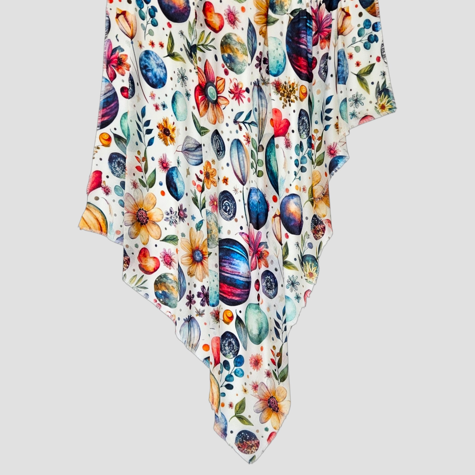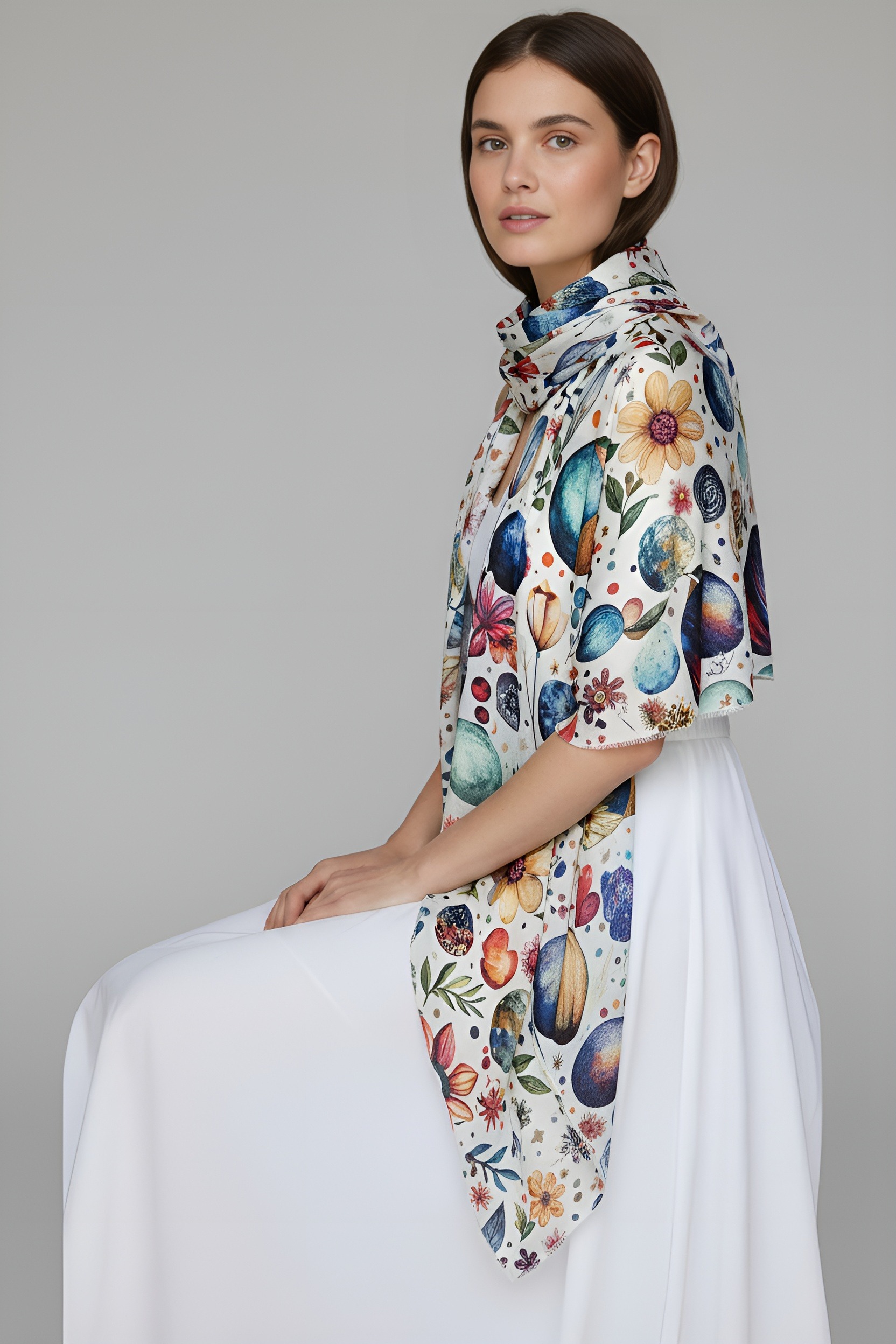 Una sciarpa leggera e fluida, in una morbida fusione di modal e seta. Su uno sfondo bianco, si dispiega un affascinante cosmo immaginario. I classici pianeti, con le sfumature color pastello di lilla, azzurro e rosa polvere, fluttuano armoniosamente accanto a piccoli fiori.