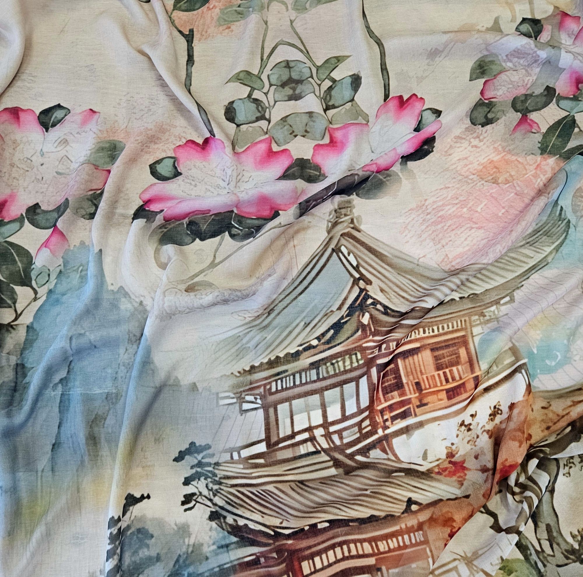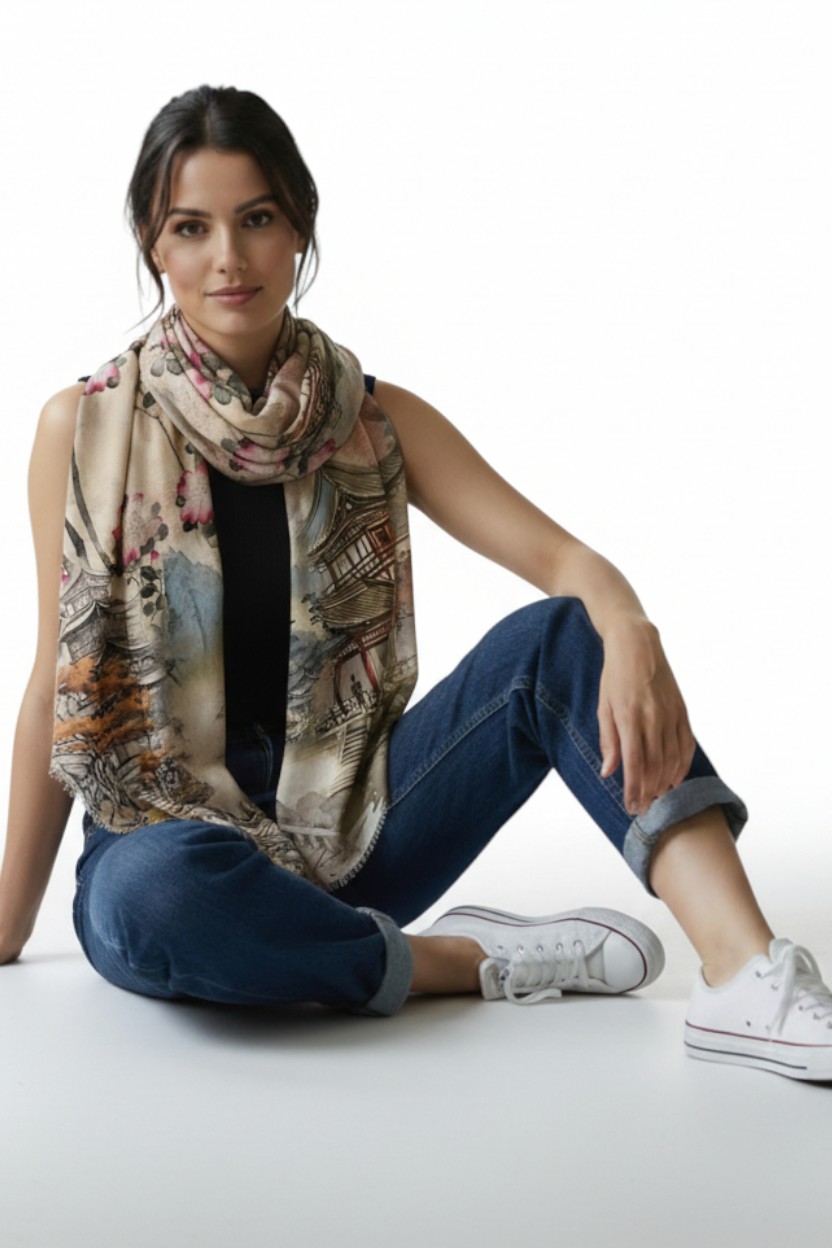 Questa sciarpa evoca l’essenza silenziosa e contemplativa del Giappone. Realizzata in un tessuto leggero e morbido. Il fondo è un raffinato beige, con al centro un elegante tempio, simbolo di armonia e tradizione ed i fiori caratteristici della cultura giapponese con i loro petali rosa.
