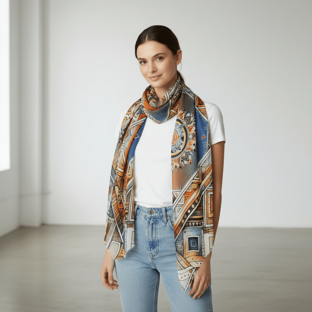 Un’armoniosa fusione di tradizione e modernità, questa sciarpa presenta elementi geometrici dal gusto etnico, che si intrecciano in un gioco di forme e colori caldi.