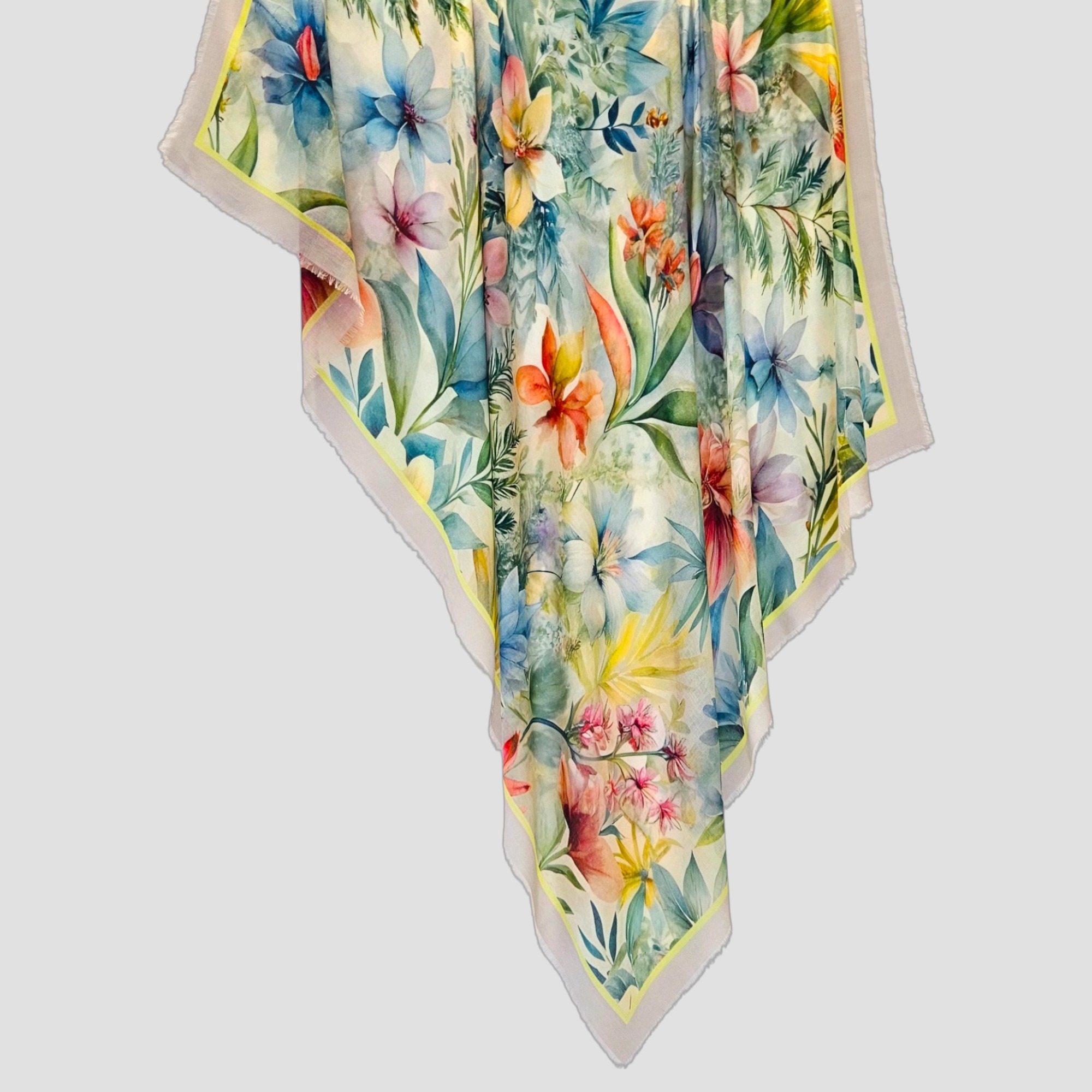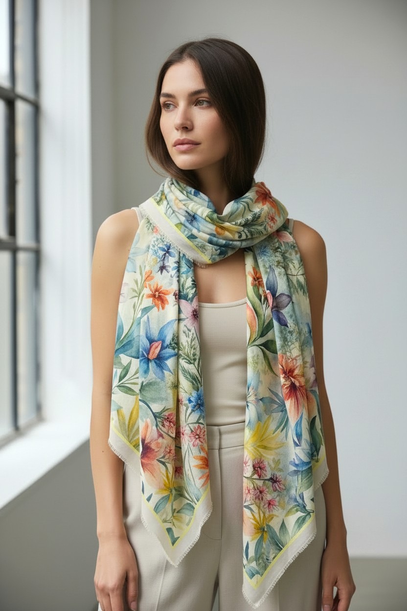 Questa sciarpa è un’esplosione di vita esotica. Realizzata in modal seta, è incredibilmente leggera, fluida e setosa al tatto, perfetta per avvolgere le spalle con eleganza senza peso.