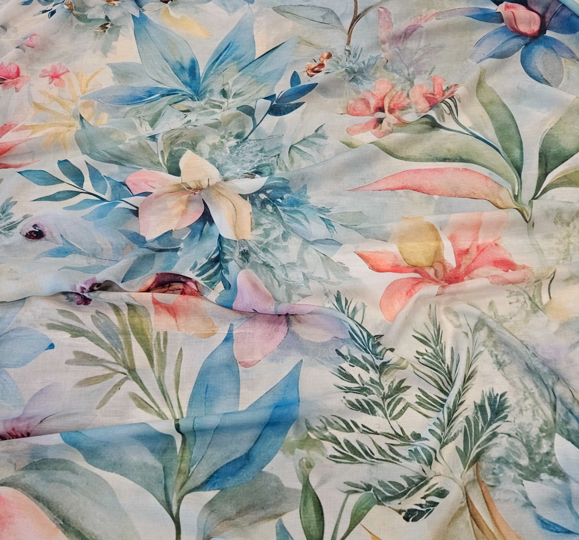 Il motivo è un floreale di fiori tropicali come orchidee o ibischi. La palette di colori vivaci.