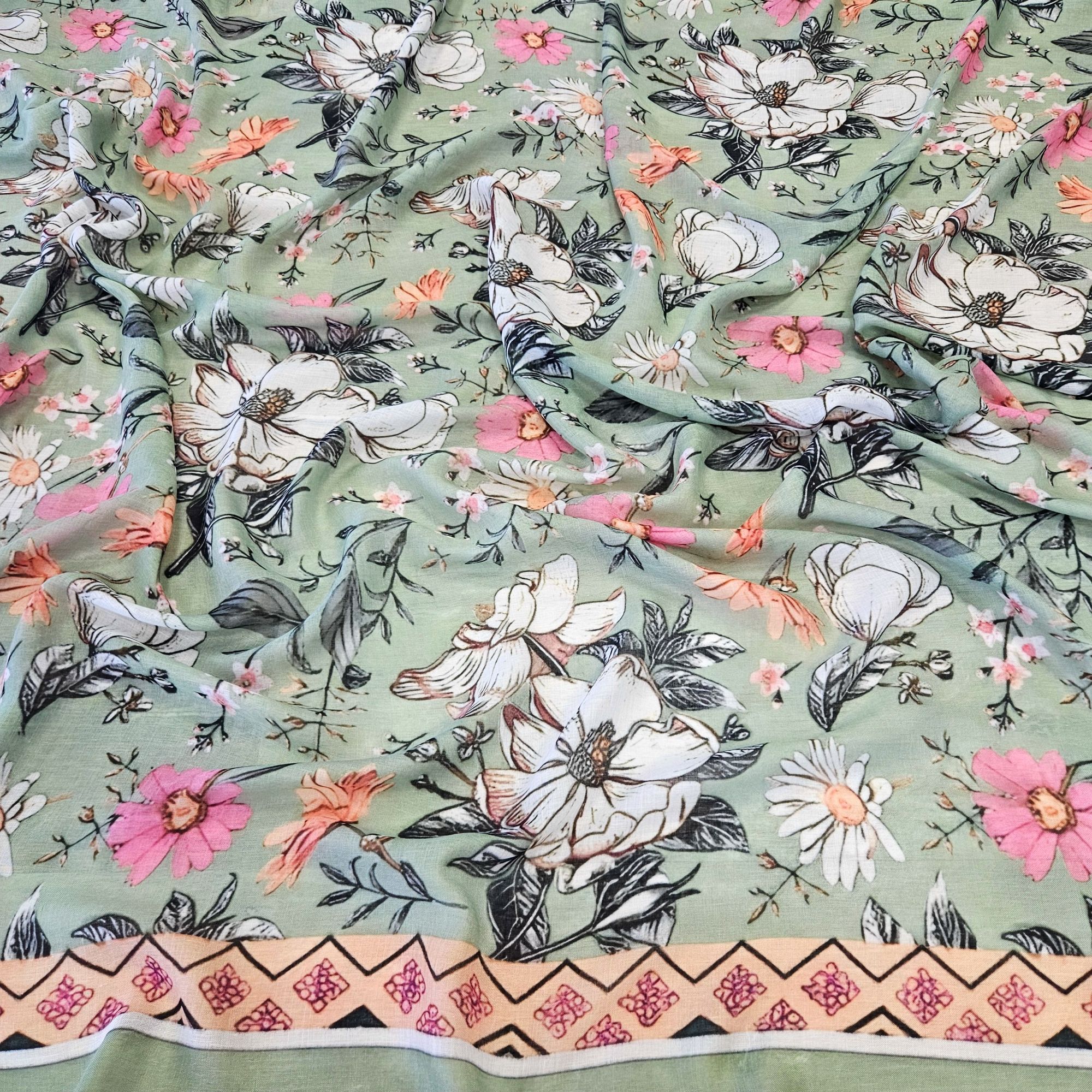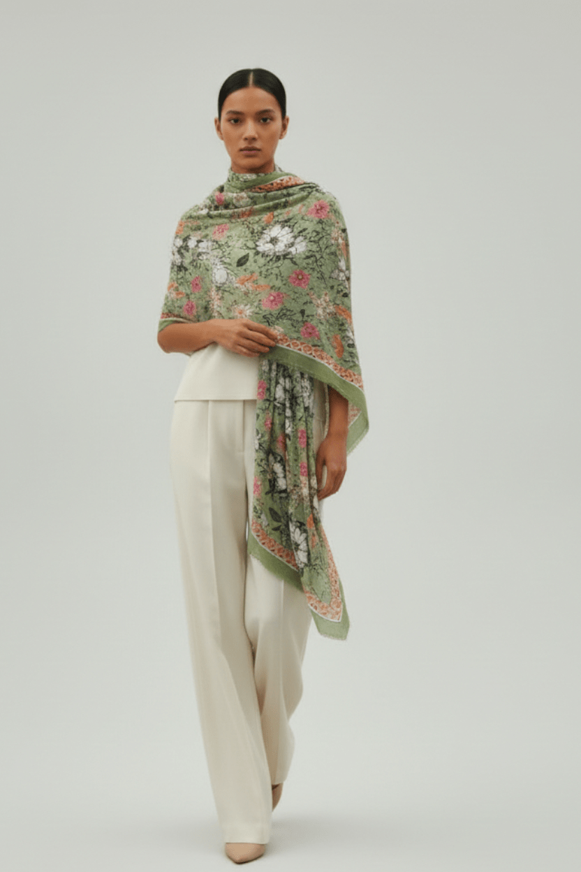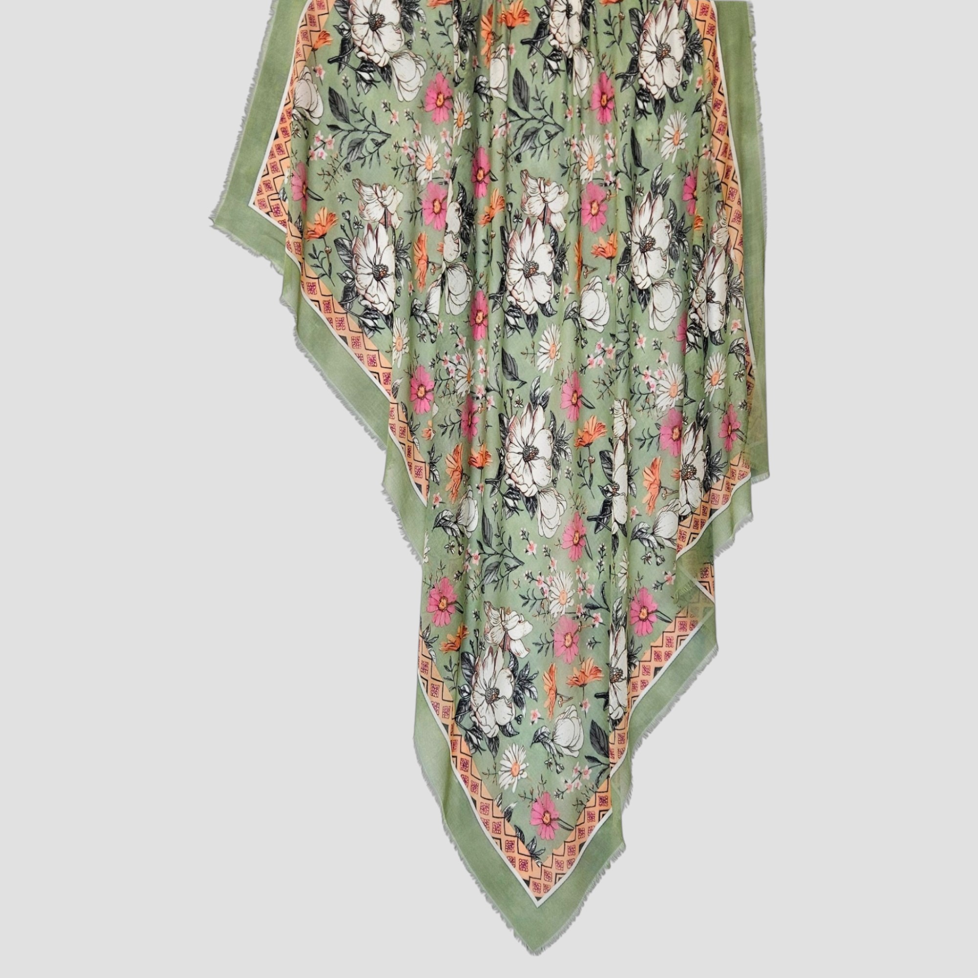 Una sciarpa leggera e vaporosa, che sembra un giardino sospeso; lo sfondo è un verde morbido, dove si dispiega un tripudio floreale che trasmette un’aria romantica, fresca e primaverile.