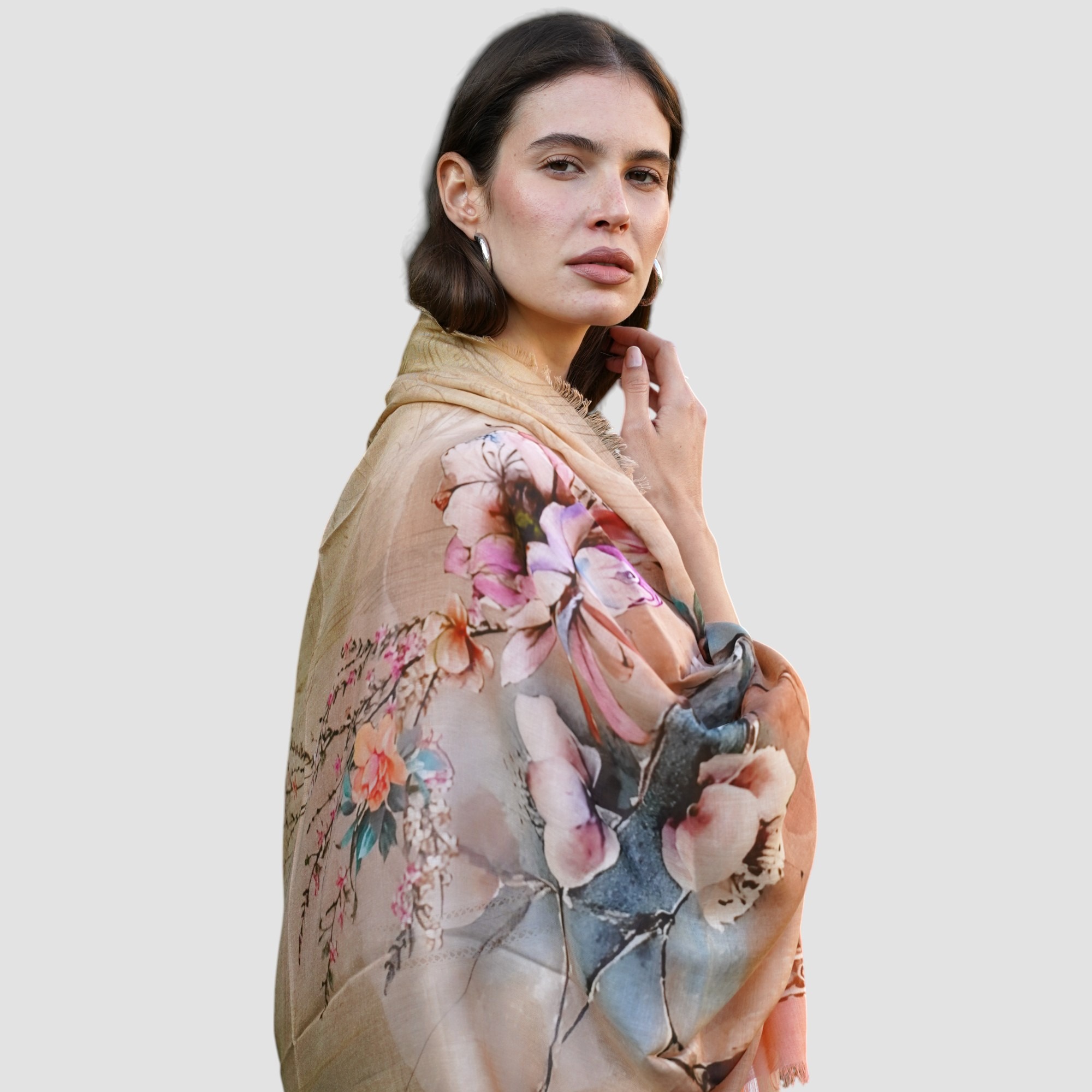 La stola sfoggia un motivo delicato, ispirato alle stampe giapponesi, dove rami fioriti si disegnano su sfondo dai toni del rosa antico, beige polveroso.
