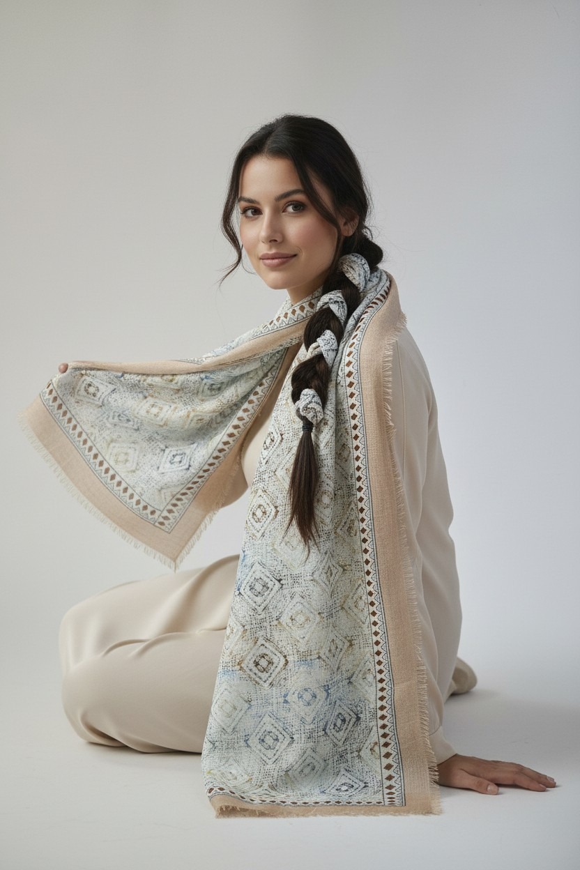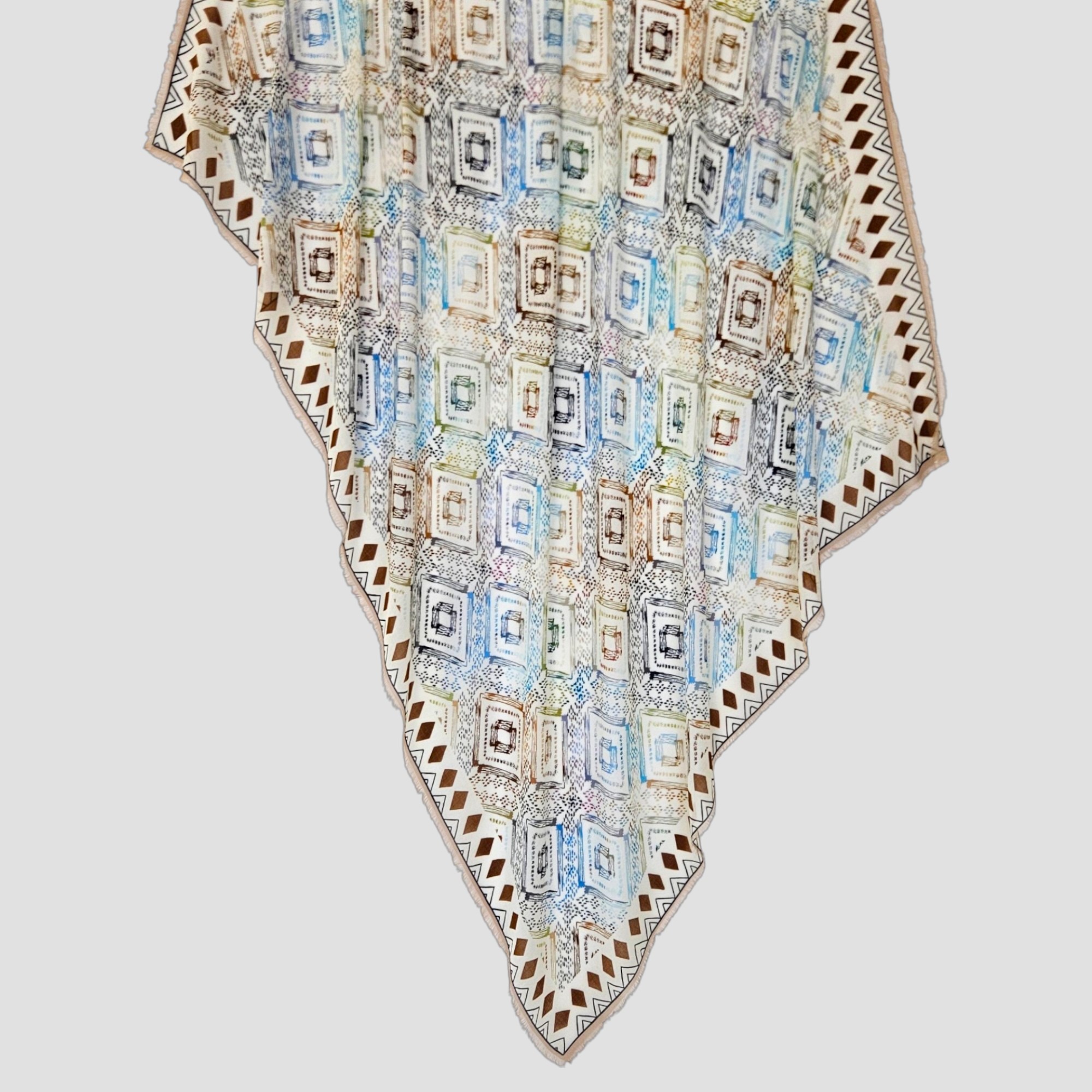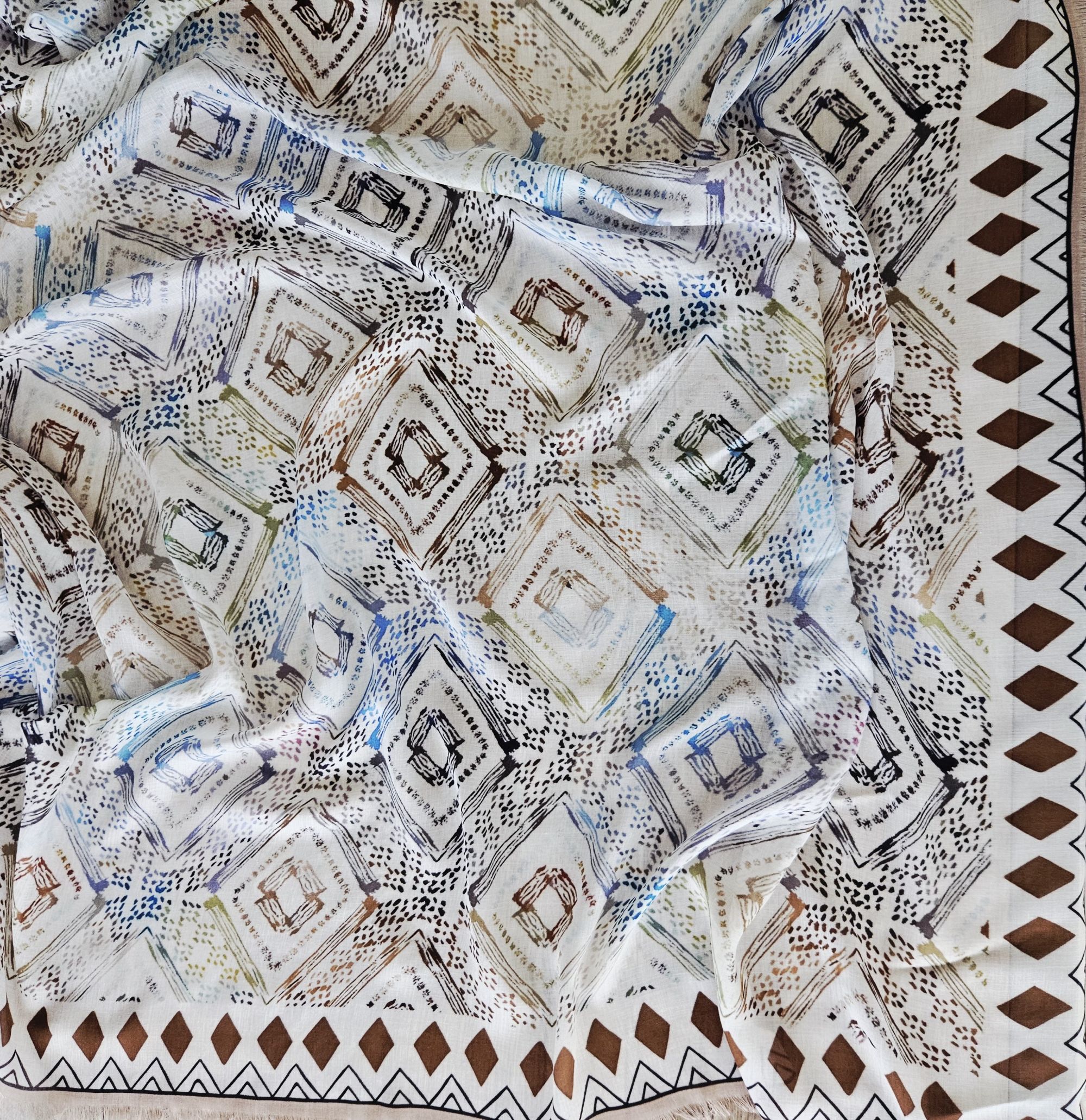 Una stola estiva leggera, dove si intrecciano rombi colorati. I toni sono caldi e terrosi – marrone, azzurro, verde sabbia – delimitati da una cornice con disegni etnici.