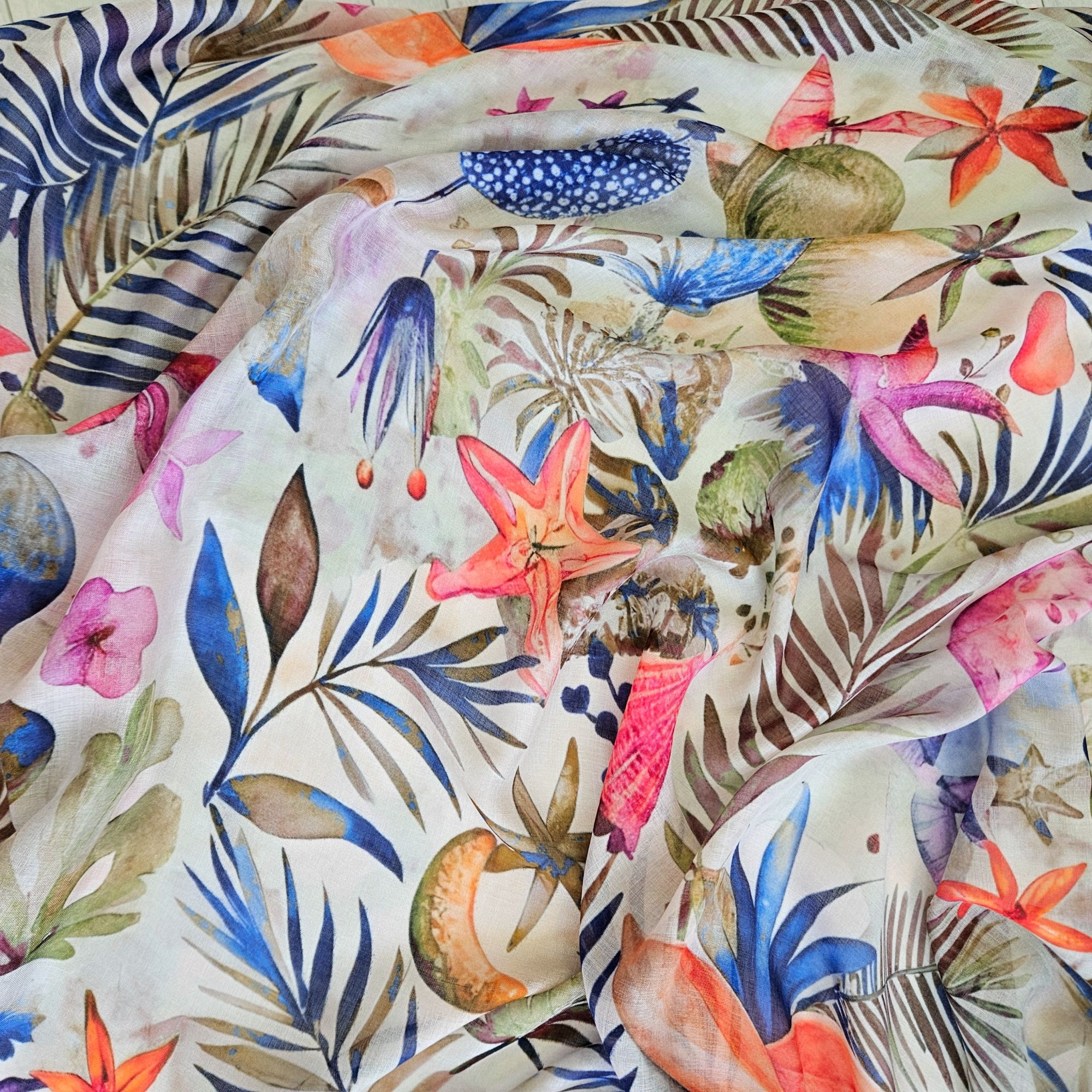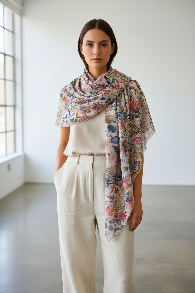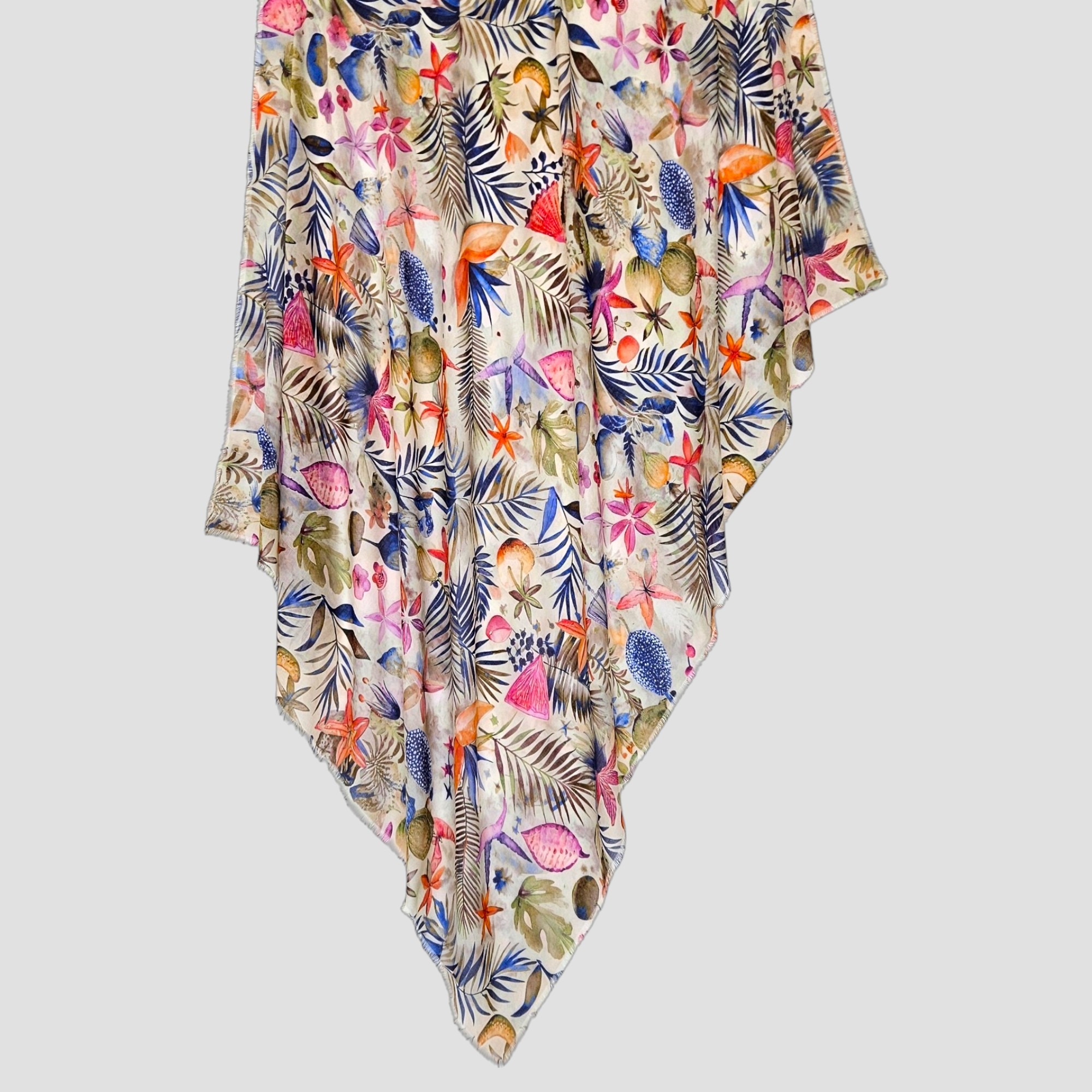 Leggera e luminosa, questa stola sfoggia una fantasia tropicale vibrante: foglie di palma e fiori d’ibisco che ricordano le atmosfere caraibiche.
